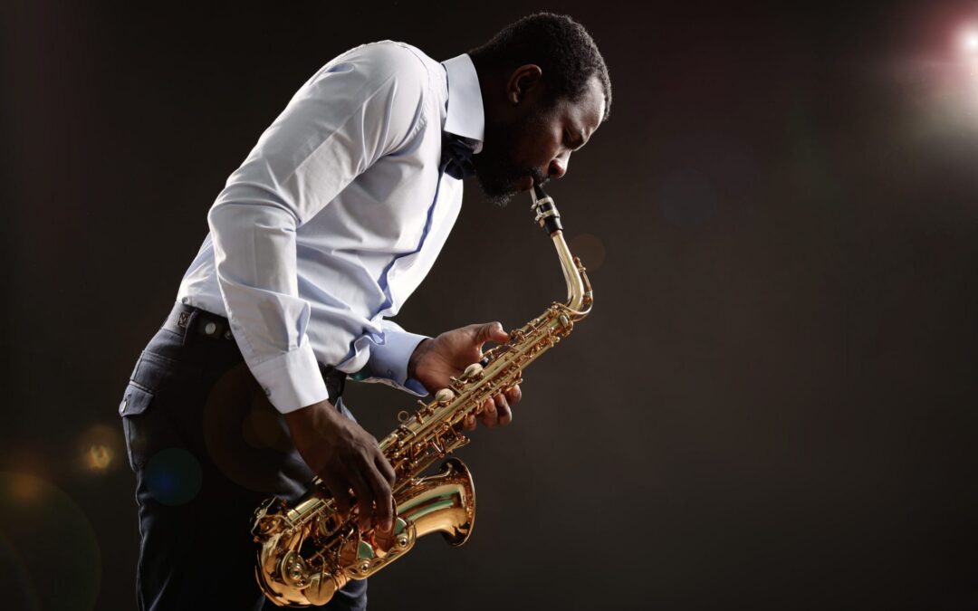 African,American,Jazz,Musician,Playing,The,Saxophone,On,Grey,Background